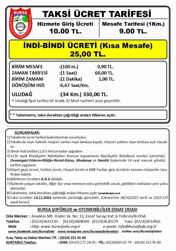 Bursa Şoförler ve Otomobilciler Esnaf Odası tarafından yapılan yazılı açıklamada, taksilerde yeni ücret tarifesi paylaşıldı.