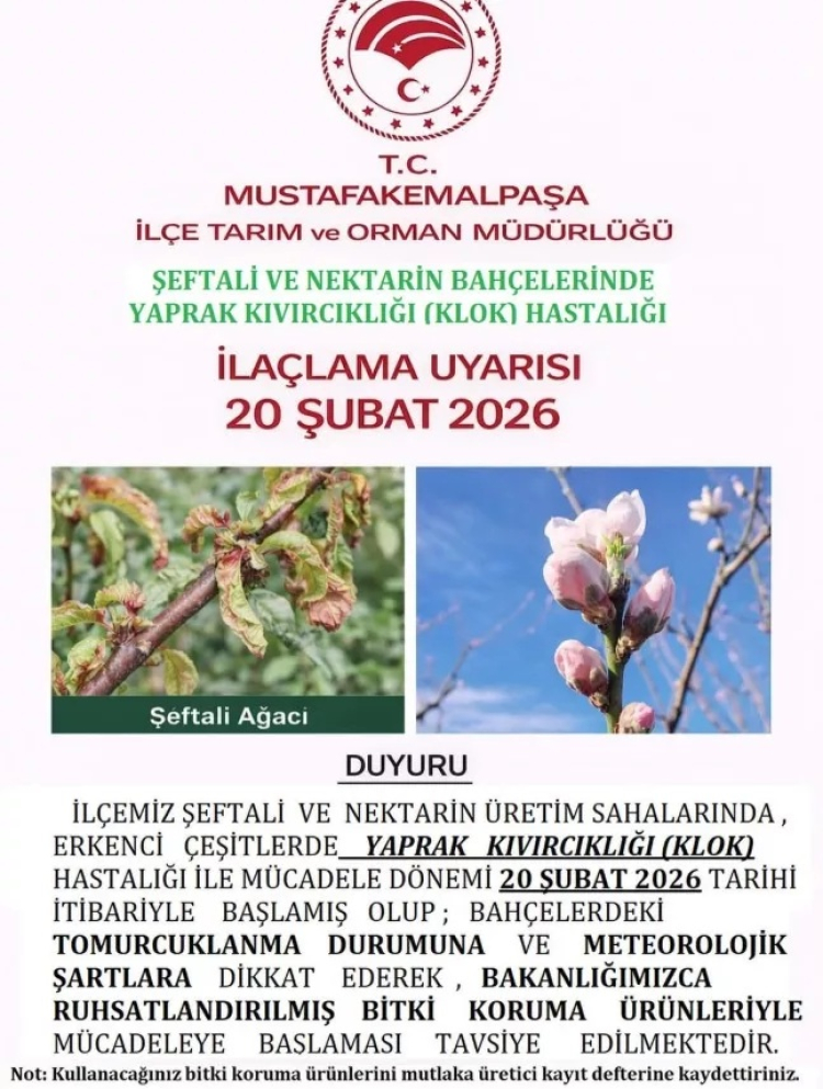Mustafakemalpaşa İlçe Tarım ve Orman Müdürlüğü, ilçede önemli bir üretim kalemi olan şeftali ve nektarin bahçeleri için kritik bir uyarıda bulundu. Müdürlükten yapılan açıklamada, yaprak kıvırcıklığı (klok) hastalığına karşı özellikle erkenci çeşitlerde mücadele döneminin 20 Şubat 2026 tarihi itibariyle başladığı duyuruldu.