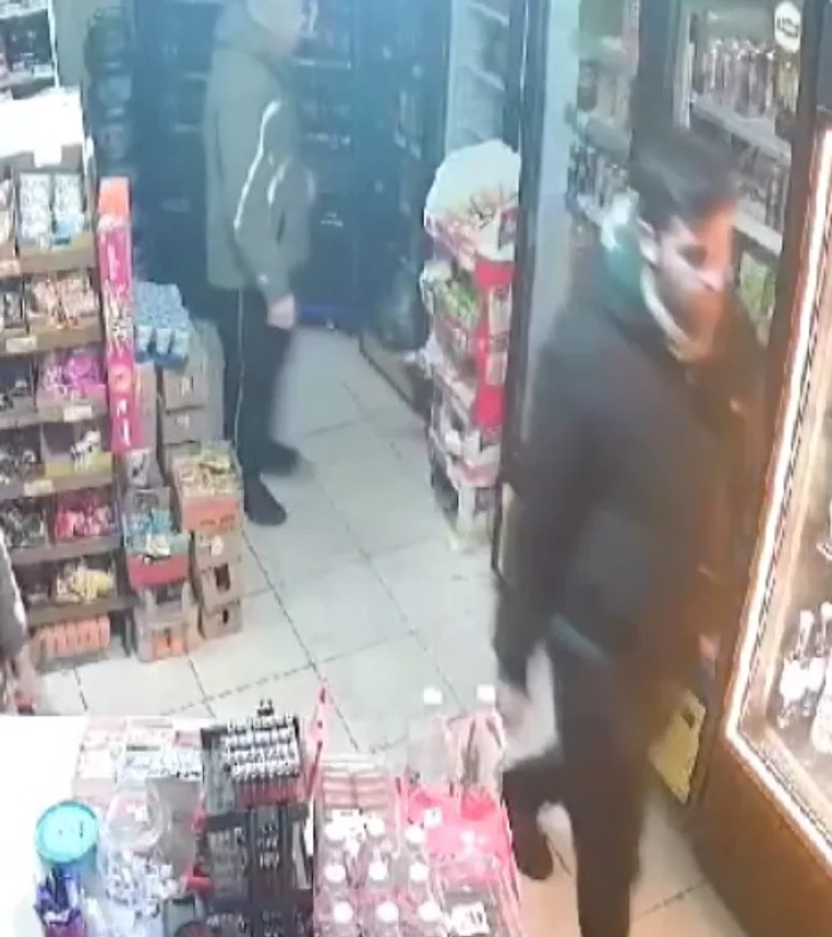 Bu arada, kar maskeli şüphelinin, tekel bayisinden hırsızlık yaptığı anlar güvenlik kamerasına yansıdı. Görüntülerde, tekel bayisine yanındaki arkadaşı ile birlikte gelen Ömer C.'nin dolaptan aldığı içki şişesini montunun içine sakladığı yer aldı. Ömer C. ile yanındaki arkadaşının soğukkanlı bir şekilde dükkandan çıkarken, bir müşteriye para üstü veren Nurettin Sülün'ün olayı fark edip, şüphelilerin peşinden gitmesi de görüldü.