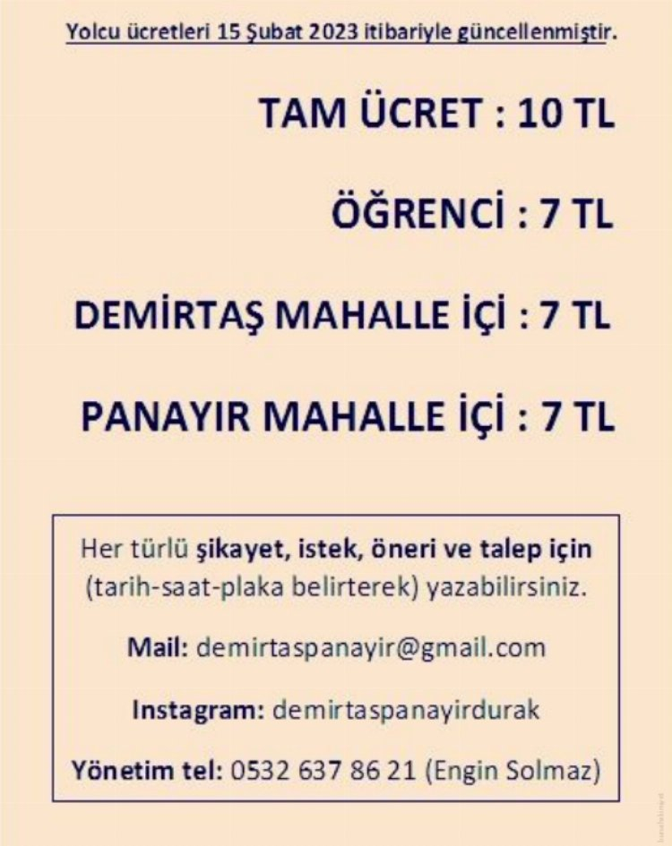 Yapılan zam sonrası tam ücret 8.5 TL'den 10 TL'ye çıkarıldı. Öğrenci ücreti 7 TL olurken Demirtaş mahalle içi ücreti ile Panayır mahalle içi ücreti 7 TL'ye çıkarıldı.