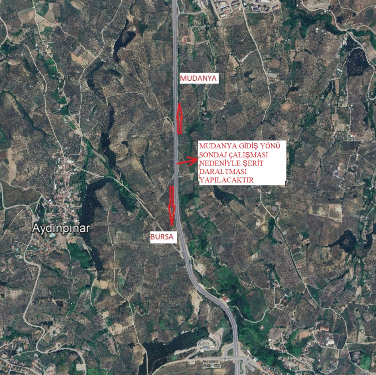 Bursa Büyükşehir Belediyesi Ulaşım Dairesi Başkanlığı tarafından yürütülen, Bursa- Mudanya Karayolu altyapısının iyileştirilmesi çalışmaları kapsamında Deprem ve Zemin İnceleme Şube Müdürlüğü tarafından yapılacak zemin etüdü ve sondaj çalışmaları nedeniyle 27 Mayıs 2025 – 20 Haziran 2025 tarihleri arasında Bursa-Mudanya Karayolu Aydınpınar mevkiinde ve Mudanya gidiş yönünde yolun en sağ şeridinde daraltma yapılacaktır.