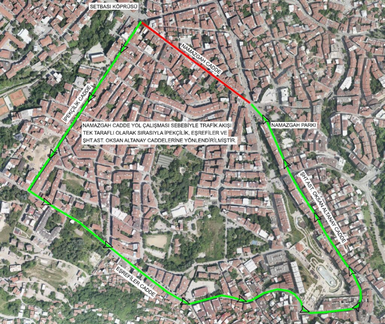 Çalışma sebebiyle 5 Mart Perşembe günü 08:00-15:30 saatleri arasında trafik akışı tek taraflı olarak sırasıyla İpekçilik, Eşrefiler ve Şehit Astsubay Oksan Altanay Caddelerine yönlendirilecektir.