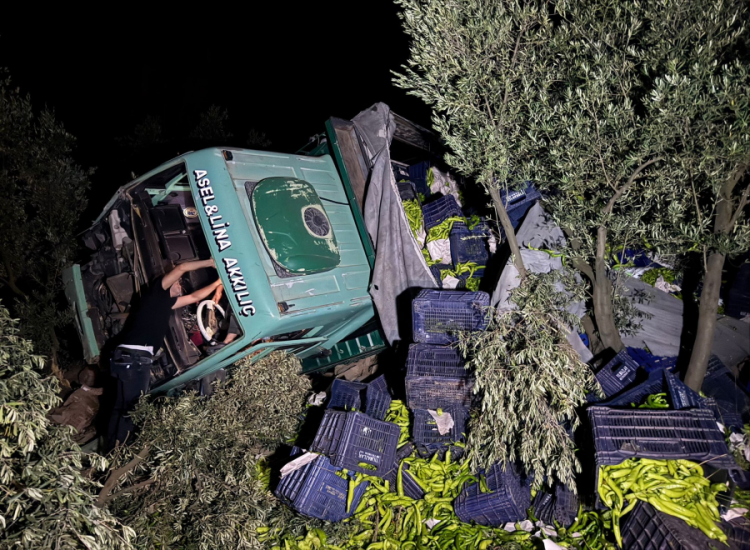 Alınan bilgiye göre Deniz Akkaya'nın kullandığı biber yüklü tır, sürücünün direksiyon hakimiyetini kaybetmesiyle kontrolden çıkarak yol kenarındaki zeytin tarlasına daldı.