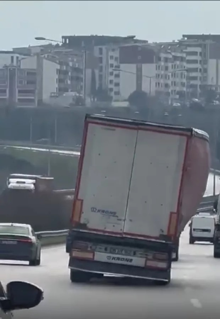 Bursa'da seyir halindeki bir tırın yolda yan şekilde ilerlemesi trafikte tehlikeli anlara neden oldu. Zaman zaman devrilme tehlikesi geçiren tır, çevredeki sürücülere korku dolu anlar yaşattı.