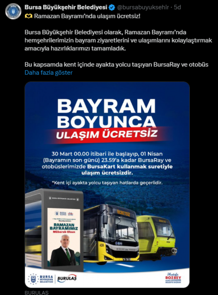 Bu kapsamda kent içinde ayakta yolcu taşıyan BursaRay ve otobüs hatlarımız, Ramazan Bayramı süresince(30-31 Mart ve 1 Nisan 2025) BursaKart kullanmak suretiyle ücretsiz olarak hizmet verecek.