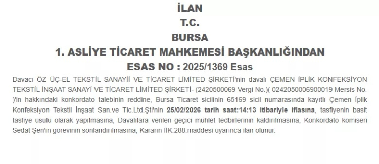 Bursa'da üretim faaliyetlerinde bulunan ünlü tekstil şirketi Çemen İplik Konfeksiyon'un konkordato talebi reddedildi. Bursa 1. Asliye Ticaret Mahkemesi, 25 Şubat 2026 tarihi itibarıyla şirketin iflasına hükmederken, basit tasfiye usulüyle alacaklıların haklarını alması süreci başlatıldı.
