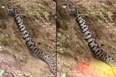 Yılanın tısladığını görünce ne yapacağını şaşıran vatandaş, kendisi de tıslayarak yılanla iletişim kurmaya çalıştı.