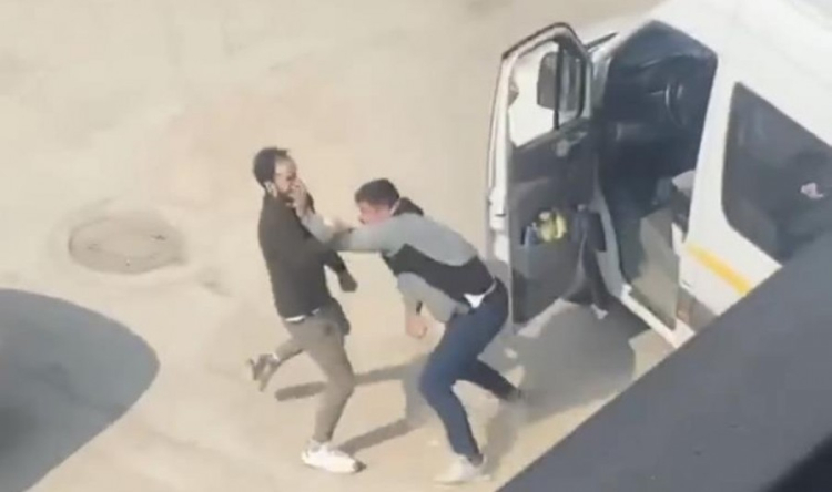Sopayla vurmakla yetinmeyen şoför, ardından yumruk darbeleriyle rakibine yöneldi. O sırada otomobil sürücüsünün yakını olduğu öne sürülen bir kadın da devreye girerek eline geçirdiği terlikle servis şoförüne vurdu.