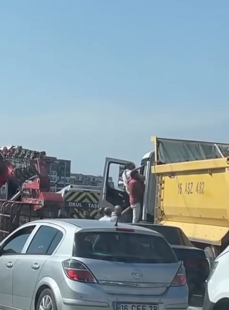 Bursa'da bir araç sürücüsü yol verme meselesi sebebiyle tartıştığı kamyon şoförünü darp etmek için kamyonetin kupasına çıkıp sürücüyü arkadaşıyla birlikte darp etti. O anlar kameraya yansırken, çevredeki sürücüler, taraflara klaksonla tepki gösterdi.
