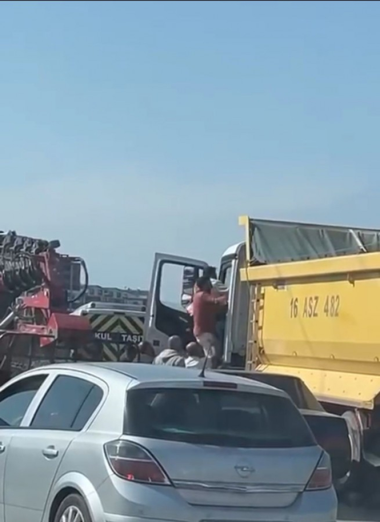 Akşam trafiğinin yoğun olduğu saatlerde seyir halindeki bir otomobilin sürücüsü ile anayolda ilerleyen kamyon sürücüsü iddiaya göre yol verme tartışması nedeniyle kavgaya tutuştu. Öfkeli otomobil sürücüsü, araçtan indiği arkadaşıyla kamyonun kupa kısmına tırmanıp, kamyon şoförünü darp etti.