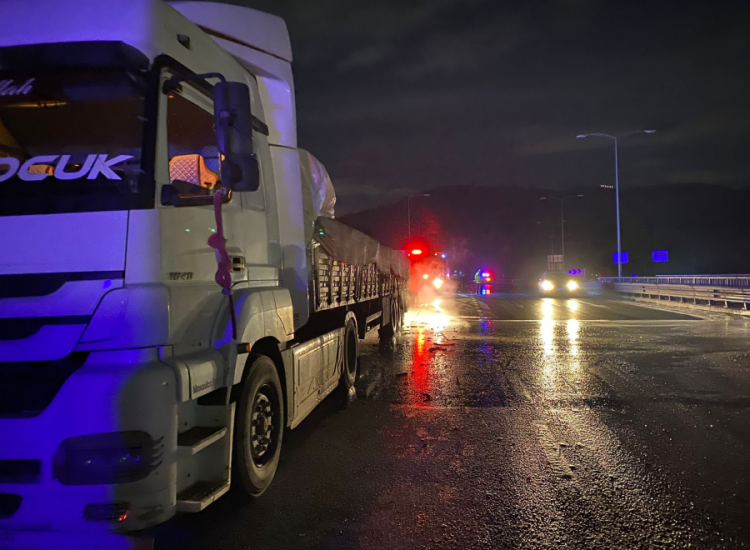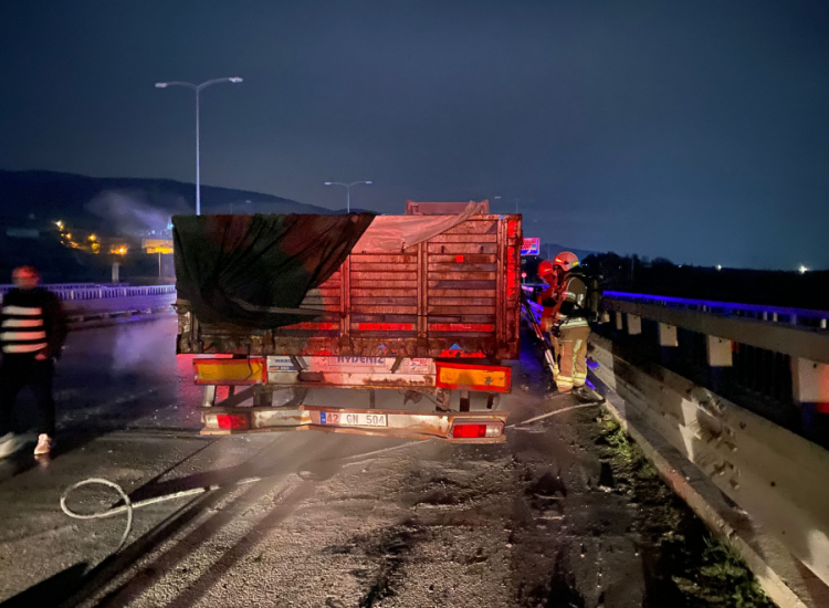 Alınan bilgilere göre Orhangazi yönüne gitmekte olan deri yüklü bir tırın seyir halindeyken lastiklerinden dumanlar ardından alevler yükselmeye başladı.