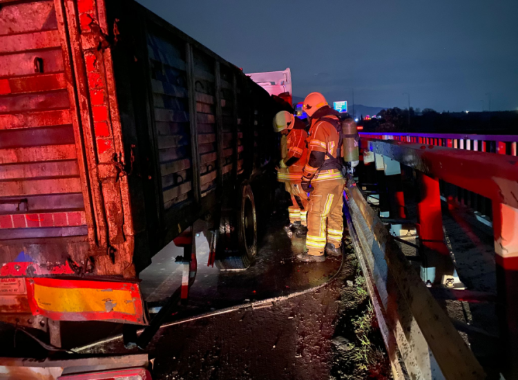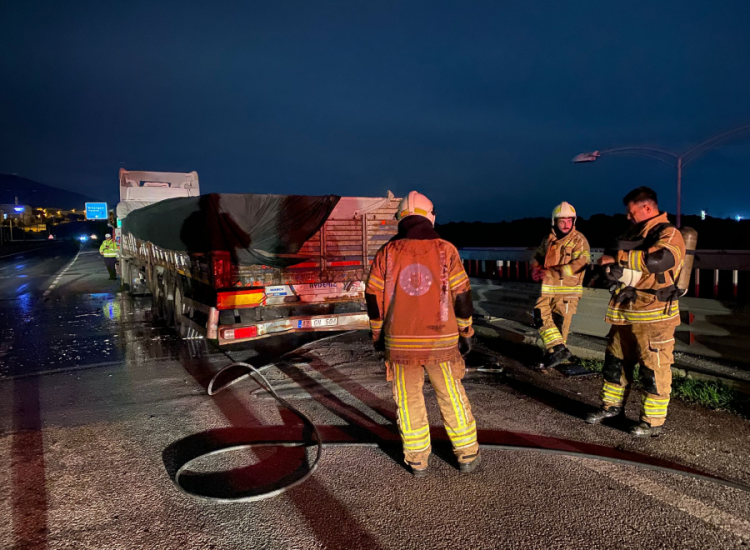 Kısa sürede olay yerine gelen itfaiye ekipleri, tır'ın lastiklerinde başlayan yangına müdahale ederek kontrol altına aldı.