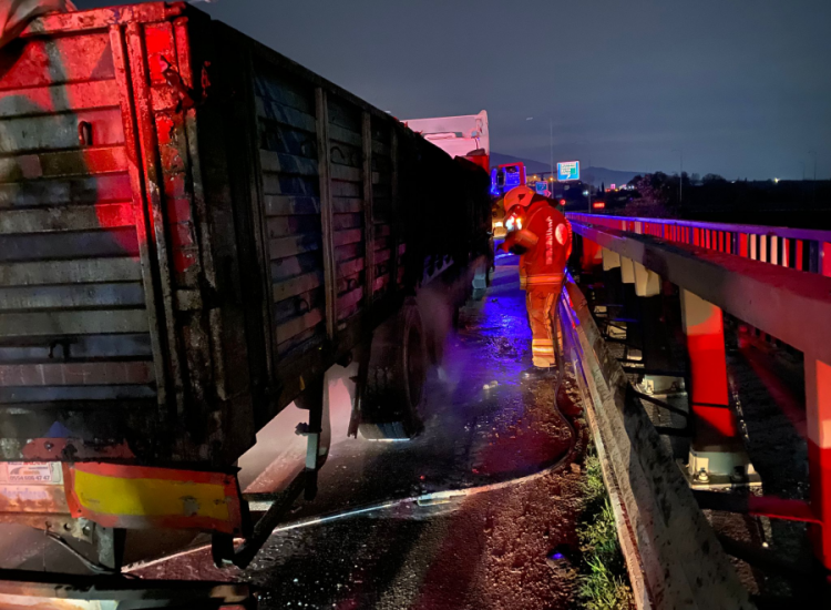 Bursa'da, Gemlik - Orhangazi yolu üzerinde seyir halinde olan deri yüklü bir tırın lastikleri yandı. İtfaiyenin erken müdahalesi sayesinde tır tamamen yanmaktan son anda kurtuldu.