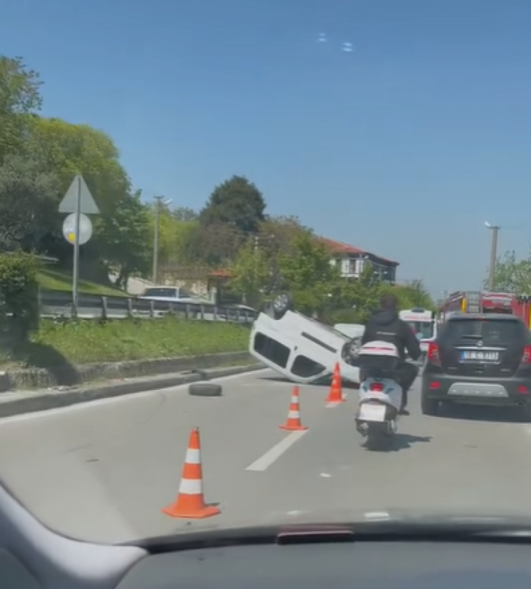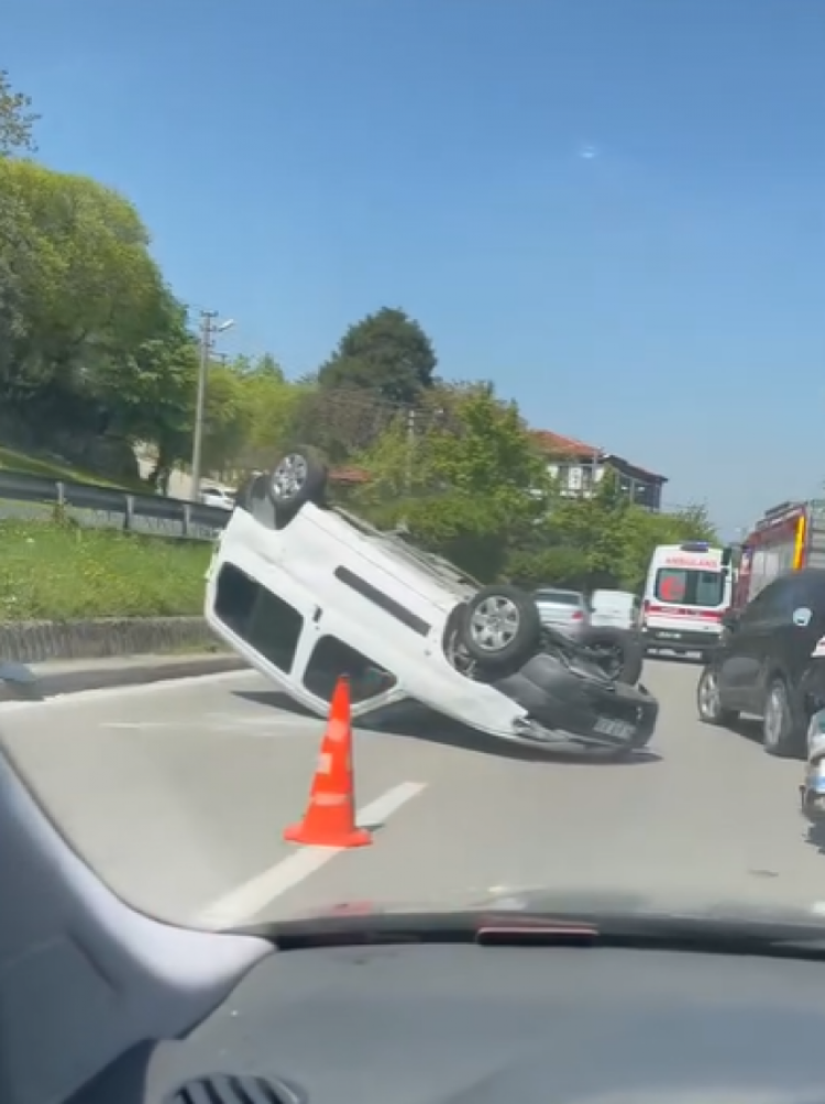 21 Nisan Pazartesi öğle saatlerinde meydana gelen kazada hafif ticari otomobil Kükürtlü caddesi üzerinde direksiyon hakimiyetini kaybederek ters döndü.