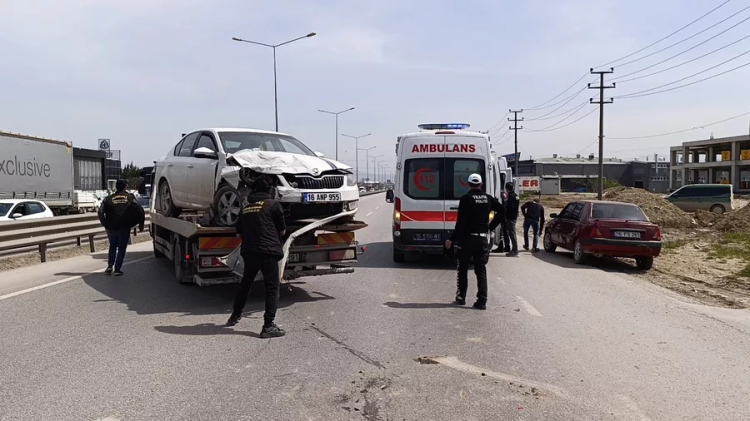 Kaza, saat 15.00 sıralarında Bursa-Ankara kara yolu İnegöl yönünde yaşandı. Ali K. (55) yönetimindeki 16 AND 955 plakalı otomobil ile akaryakıt istasyonundan yola çıkan Hasan M. idaresindeki 16 APH 176 plakalı otomobil çarpıştı. Kontrolden çıkan araçlar, yolun sağında park halindeki 16 ALN 038 plakalı kamyona ardından Halil A.'nın (40) içinde olduğu 16 FS 265 plakalı otomobile çarptı.