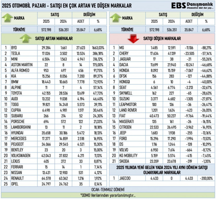 Bursada Bugün'ün köşe yazarı Emre Özpeynirci'nin sosyal medyada paylaştığı verilere göre, Türkiye'de otomobil satışları 2025 yılının Ocak-Temmuz döneminde geçen yılın aynı dönemine göre %6,7 artarak 572 bin 198 adede ulaştı. Ancak büyüyen pazarda markalar arasındaki performans farkı dikkat çekti. ODMD verilerine göre, Bursalı markalar arasında bulunan Togg ve Renault satışlarını artırırken, bir döneme damga vuran Fiat'ta büyük kan kaybetti.
