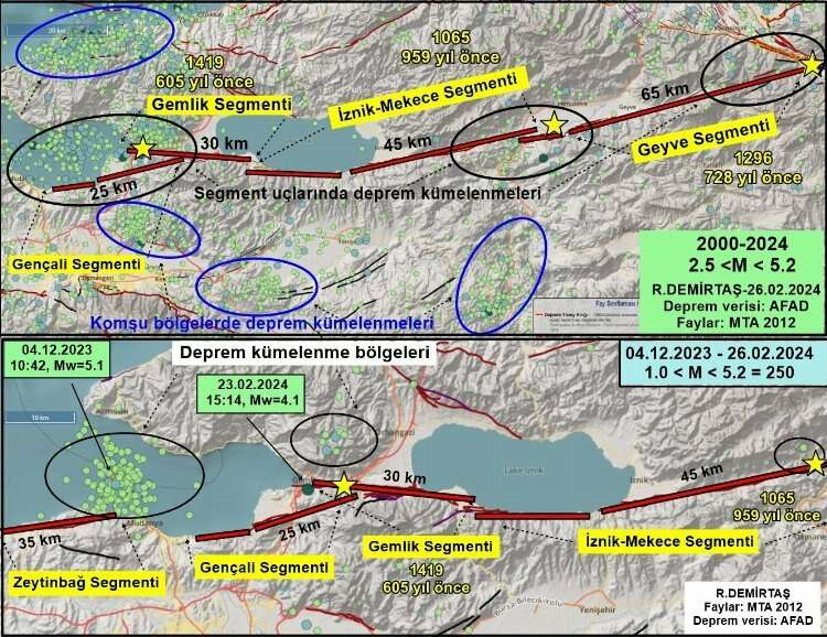 Bursa'da art arda yaşanan depremler sonrası açıklama yapan Paleosismolog Dr. Ramazan Demirtaş, "Özellikle en son depremi 905 yıl önce 1065 yılında üretmiş İznik-Mekece segmenti deprem üretme potansiyeli açısından önemli derecede risk taşımaktadır. Eğer kayma hızını 3.0 mm/yıl olarak kabul edersek, birikim olmuş demektir ki, bu da 6.5-7.0 büyüklüğündeki depremlere karşılık gelmektedir." dedi.