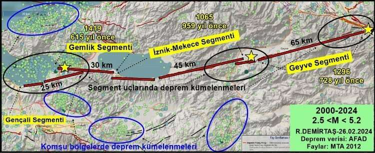 Bilindiği üzere hazırlık evresi depremleri sırasında ana segment gövdeleri suskun kalırken, segment uçları ve komşu faylar üzerinde yoğun deprem kümelenmeleri olmaya devam eder. Özellikle en son depremi 905 yıl önce 1065 yılında üretmiş İznik-Mekece segmenti deprem üretme potansiyeli açısından önemli derecede risk taşımaktadır. Geyve-Mekece-Gemlik kolunun kayma hızı 1.0-3.0 mm/yıl gibi düşük olması nedeniyle deprem tekrarlanma aralığı ortalama 800-1000 yıl aralığında kabul edilebilir. Ancak tekrarlanma aralıkları sabit değil ve karakteristik bir davranış göstermezler.
