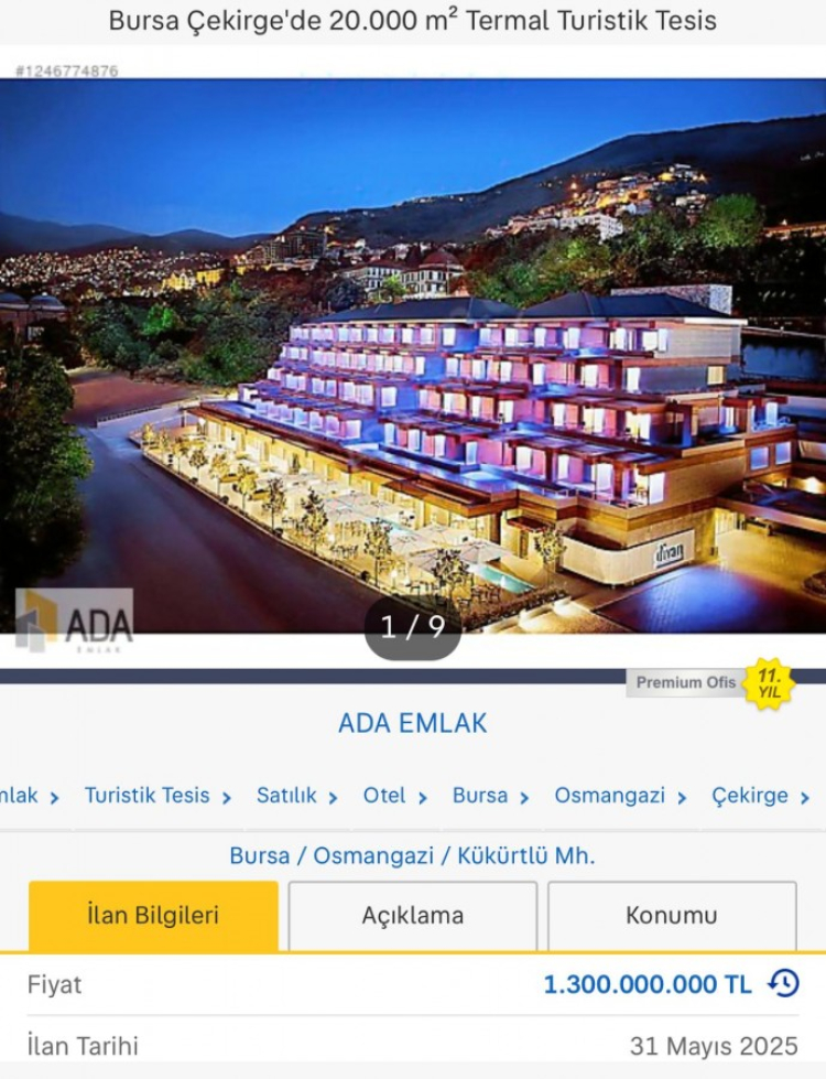 Lüks otelin satış fiyatı tam 1 milyar 300 milyon TL olarak açıklandı. Otel, Bursa'nın en değerli bölgelerinden birinde yer alıyor. Koç Holding bünyesinde bulunan Divan Grubu, ulusal ve uluslararası 17 otel, 3 rezidans, ikisi yurt dışında olmak üzere 23 pastane, 13 restoran, 3 stadyum operasyonu ve Eataly operasyonu, 2 ziyafet birimi ile faaliyet gösteriyor.