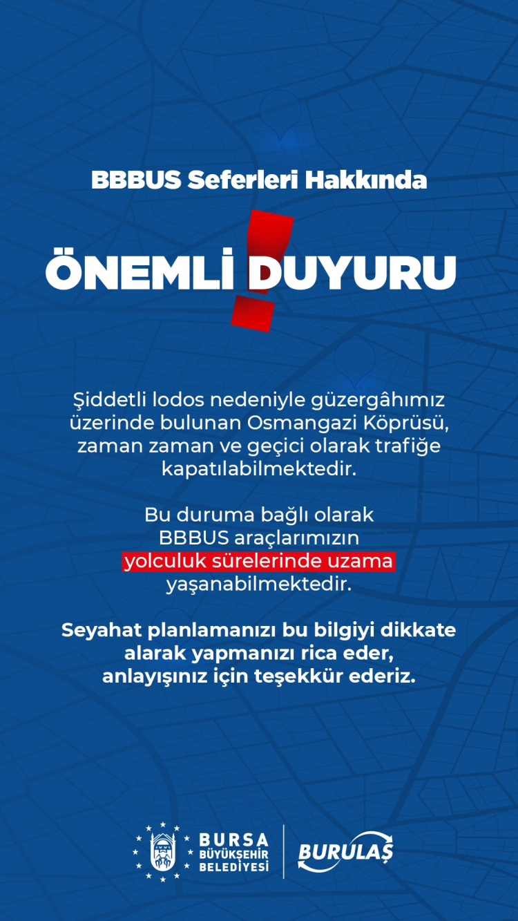 “Şiddetli lodos nedeniyle güzergâhımız üzerinde bulunan Osmangazi Köprüsü, zaman zaman ve geçici olarak trafiğe kapatılabilmektedir. Bu duruma bağlı olarak BBBUS araçlarımızın yolculuk sürelerinde uzama yaşanabilmektedir. Seyahat planlamanızı bu bilgiyi dikkate alarak yapmanızı rica eder, anlayışınız için teşekkür ederiz.”