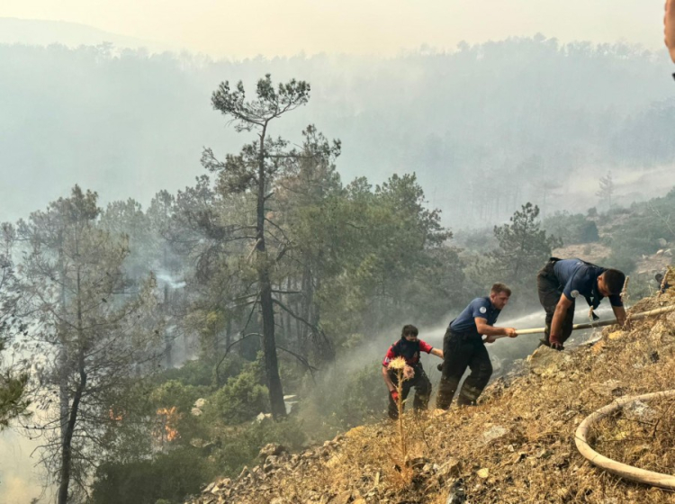 Göz gözü görmeyen bölgede sıcağın etkisiyle ve esen rüzgarla beraber alevler daha çok şiddetleniyor.