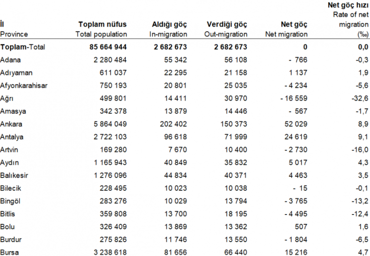 Türkiye'de iller arası göç eden nüfusun dağılımına bakıldığında; İstanbul 395 bin 485 kişi ile en çok göç alan il oldu. İstanbul'u sırasıyla 202 bin 402 kişi ile Ankara ve 117 bin 889 kişi ile İzmir takip etti. En az göç alan iller ise sırasıyla 4 bin 570 kişi ile Ardahan, 5 bin 644 kişi ile Bayburt ve 6 bin 739 kişi ile Tunceli oldu.