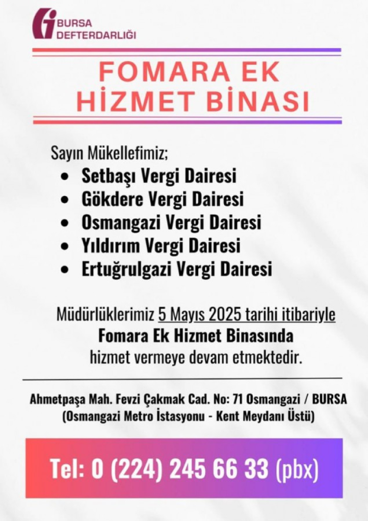 "Vatandaşlarımıza daha güvenli, etkin bir hizmet sunmak amacıyla, 15 Temmuz 2023 tarihinden itibaren Vişne Hizmet Binasında faaliyet gösteren Gökdere, Osmangazi, Setbaşı, Yıldırım Vergi Dairesi Müdürlükleri ile Ataevler Ek Hizmet Binasında faaliyet gösteren Ertuğrulgazi Vergi Dairesi Müdürlüğü; 05 Mayıs 2025 Pazartesi günü itibariyle Ahmetpaşa Mahallesi Fevzi Çakmak Caddesi No:71 Osmangazi / Bursa adresinde bulunan ve depreme karşı güçlendirilmiş olan Fomara Ek Hizmet Binasında hizmet vermeye başlamıştır.