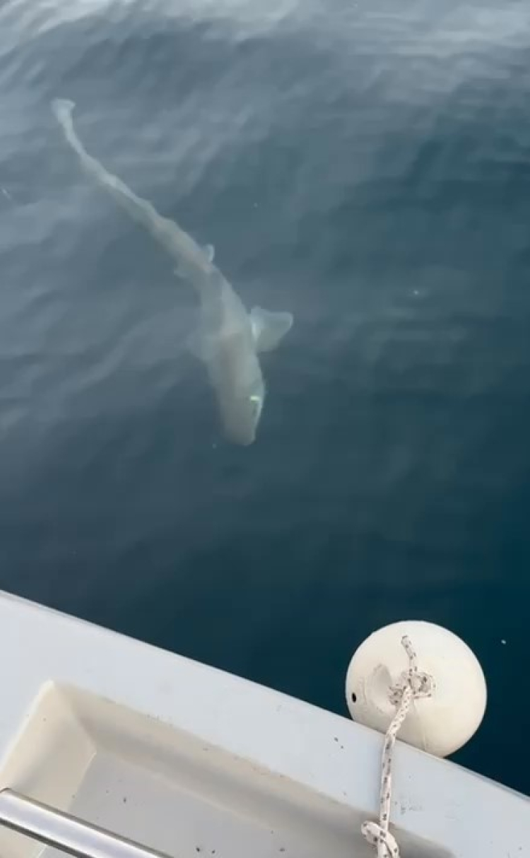 Kısa süreli şaşkınlık yaşayan balıkçılar, dikkatli bir şekilde köpek balığını tekneye almayı başardı.