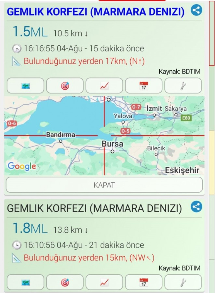 Bursa Gemlik Körfezi'nde 1.5 büyüklüğünde deprem meydana geldi.
