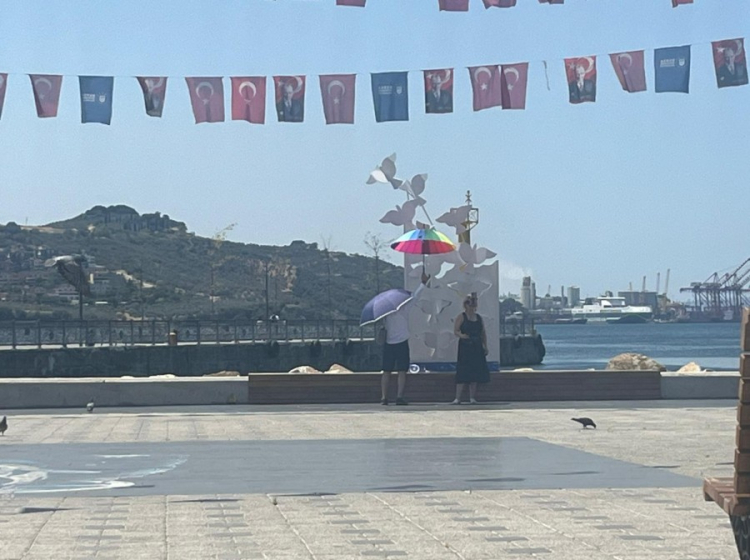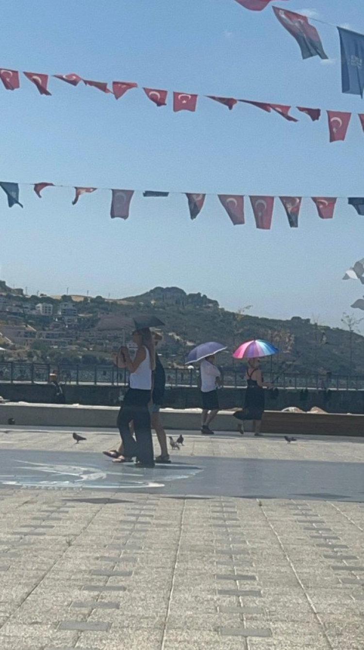 Sıcak havadan korunmak için vatandaşların seçtiği şemsiyeli yöntem ise yüzleri güldürdü.