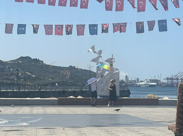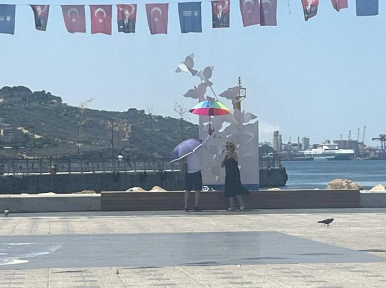 Hal böyle olunca vatandaşlar Gemlik'in sahil kenarlarında sıcak havadan korunmak için şemsiyeleriyle dolaştı.
