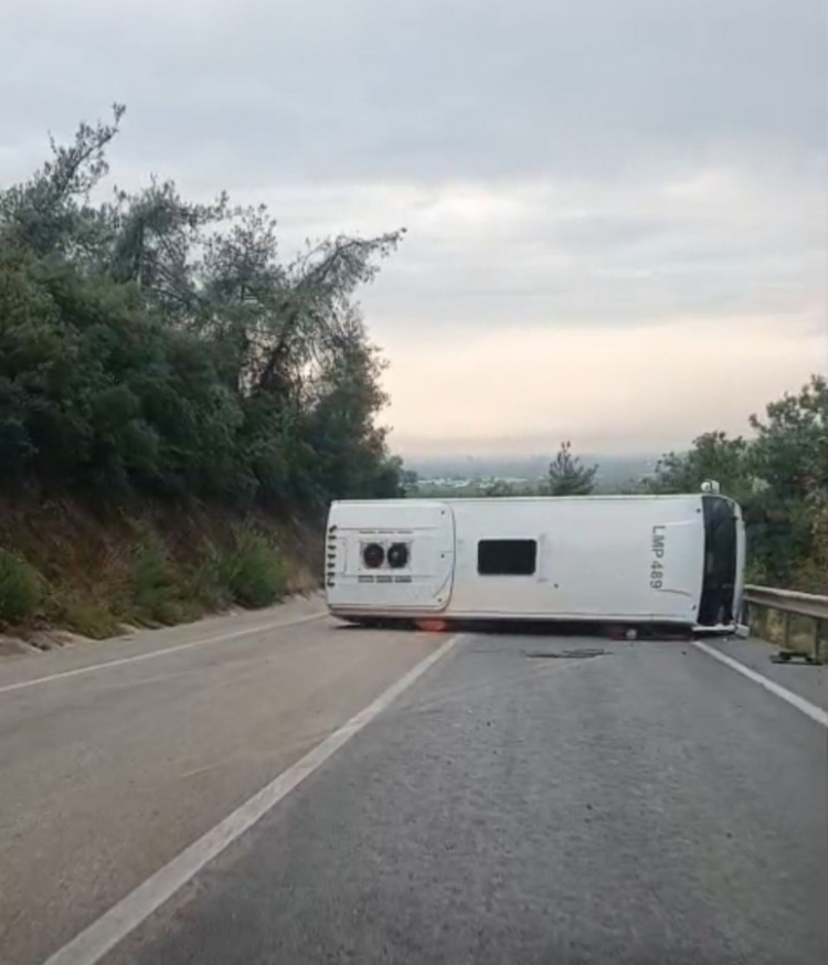 Bursa'nın Gürsu ilçesi TOKİ yolu üzerinde sabah saatlerinde trafik kazası meydana geldi. Sürücüsünün kontrolünü kaybetmesiyle devrilen servis minibüsü yolun ortasında yan yattı.