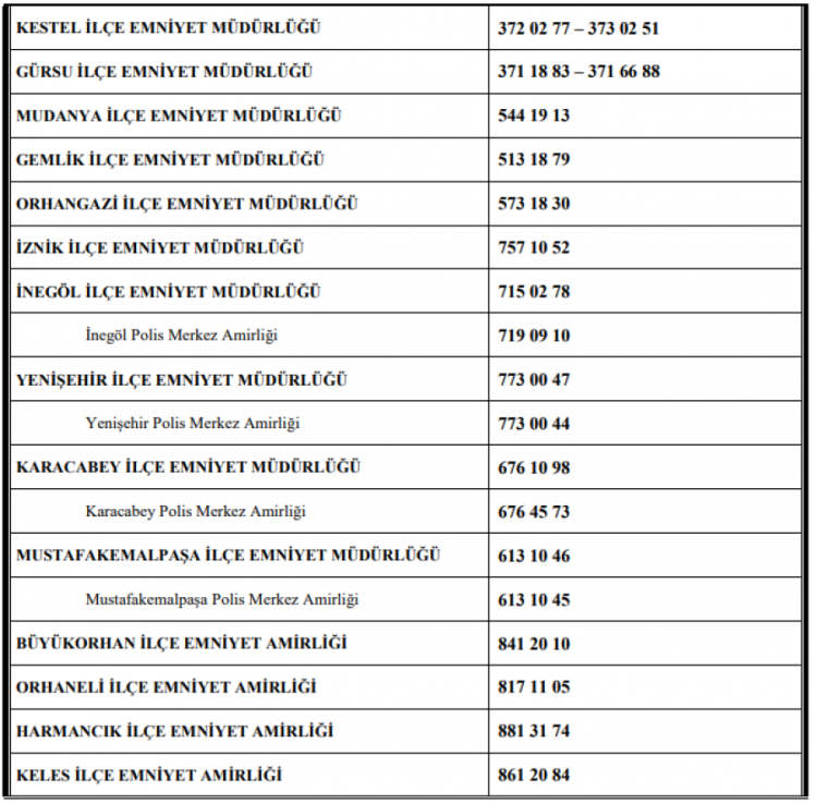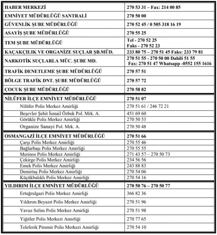 Bursa İl Emniyet Müdürlüğü'nün yayınadığı bülten ise şu şekilde, "Kurban Bayramı münasebetiyle vatandaşlarımızın huzur ve güven dolu bir ortamda bayram tatili geçirmelerini sağlamak amacıyla, vatandaşlarımızın istek ve şikayetlerini anında ilgili merciilere iletebilmeleri için İl Emniyet Müdürlüğümüze ve İlçe Emniyet Müdürlüklerimize / Amirliklerimize ait önemli telefonlar aşağıda belirtilmiştir".