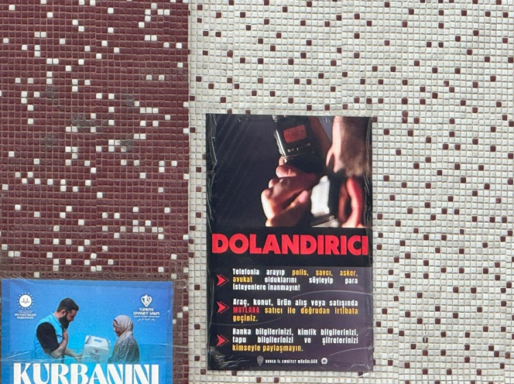 Bursa İl Emniyet Müdürlüğü'nün farkındalık çalışmasında telefonla arayarak kendini polis, asker, avukat ve savcı olarak tanıtan dolandırıcılara karşı uyarı ibarelerinin yer aldığı bir yazı asıldı. Broşürde, "Telefonla arayıp polis, savcı, asker ve avukat olduklarını söyleyip para isteyenlere inanmayın. Araç, konut, ürün alış veya satışında mutlaka satıcı ile doğrudan irtibata geçiniz. Banka bilgilerinizi, kimlik bilgilerinizi, tapu bilgilerinizi ve şifrelerinizi kimseyle paylaşmayınız" uyarıları yer aldı.
