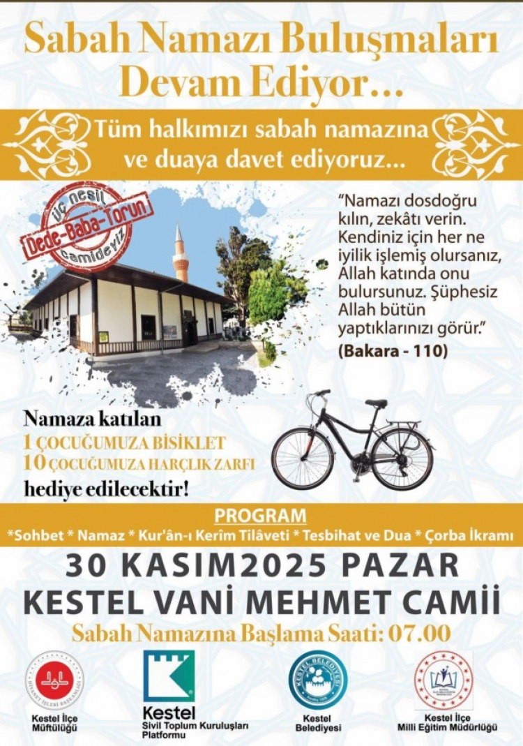 Kestel'de gelenekselleşen "Dede-Baba-Torun Sabaha Namazında" buluşmaları, 2014 yılından bu yana aralıksız devam ediyor. 1 Ocak 2014'te Ulu Cami'de bir araya gelen bir grup namaz gönüllüsünün, "Neden her ay ilçemizde sabah namazı buluşması yapılmasın?" fikriyle başlattığı etkinlik, bugün yüzlerce öğrenciyi ve aileyi camilerde buluşturan bir dayanışma hareketine dönüştü.