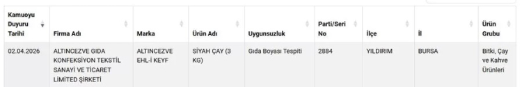 Son olarak "Bitki, Çay ve Kahve Ürünleri" kategorisinde Bursa'da faaliyet gösteren bir marka ifşa edildi. Laboratuvar incelemelerinde, "ALTINCEZVE EHL-İ KEYF" markasına ait siyah çayda, ürüne daha iyi bir renk vermek amacıyla gıda boyası karıştırıldığı ortaya çıktı.