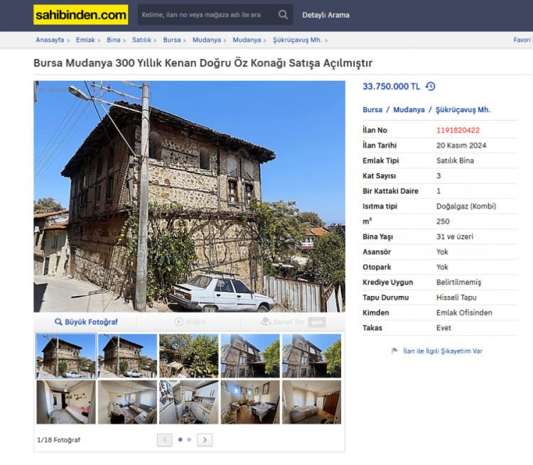 Bursa'nın Mudanya ilçesinde yer alan 300 yıllık Kenan Doğru Öz Konağı, sahibinden.com'da satışa çıkartıldı.