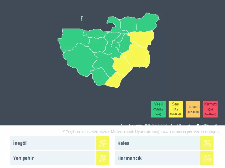 Bursa'da ise başta İnegöl ve Keles olmak üzere Yenişehir ve Harmancık ilçeleri için kritik uyarı yapıldı. 8 Nisan gece saatlerinden itibaren başlaması beklenen don olayının 11 Nisan sabahına kadar etkili olacağı bildirildi.
