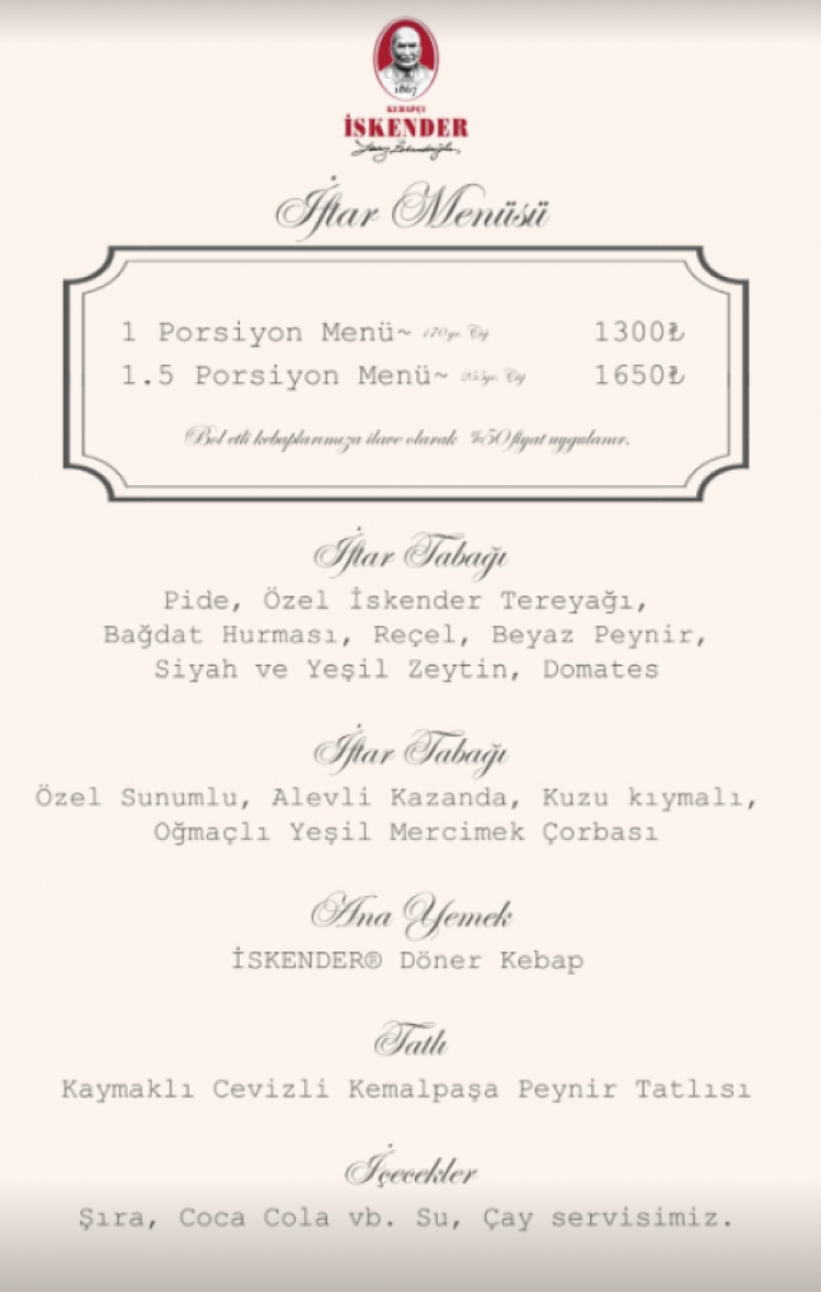 1867'den beri hizmet veren, Bursa'nın meşhur İskender'ini yıllardır masalara sunan dünyaca ünlü kebapçı, Ramazan ayına özel iftar menülerini ve fiyatlarını paylaştı. Ortaya çıkan fiyat etiketleri ise görenleri şaşırttı.