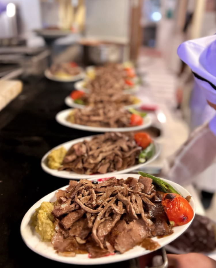 Ana yemek olarak, ünlü İskender Döner Kebap bulunurken yemeğin akabinde tatlı olarak kaymaklı cevizli kemalpaşa peynir tatlısı servis ediliyor.