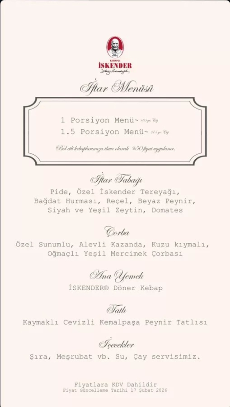 1867'den beri hizmet veren, Bursa'nın meşhur İskender'ini yıllardır masalara sunan dünyaca ünlü Kebapçı İskender, Ramazan ayına özel iftar menülerini ve fiyatlarını paylaştı.