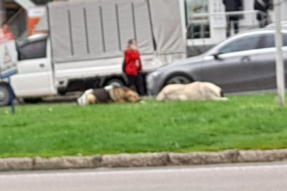 Caddenin ortasında bulunan sokak köpekler, karşıdan karşıya geçmeye çalışan vatandaşları tedirgin etti