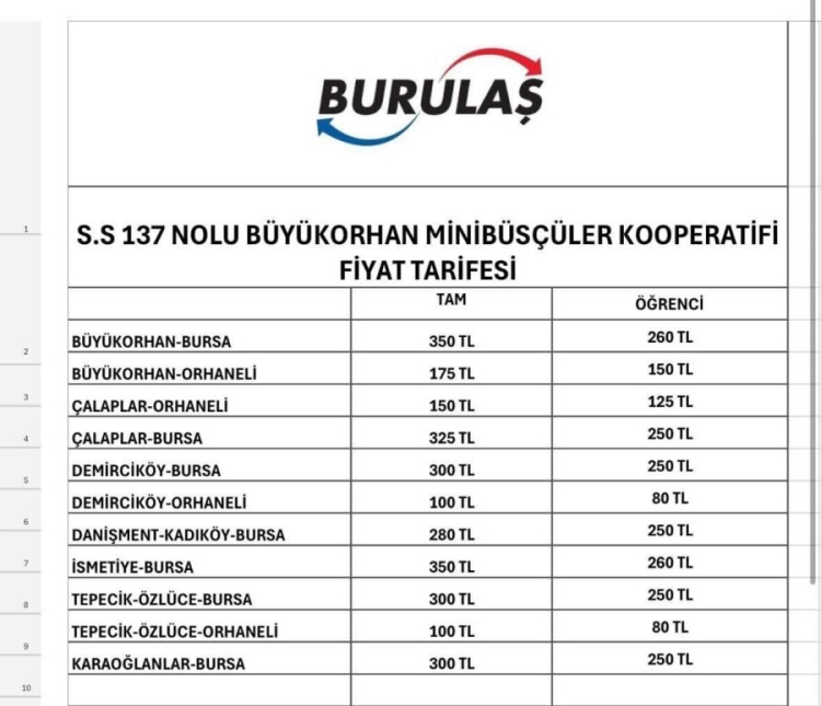 Bursa'nın Büyükorhan ilçesi ulaşımına zam geldi. BURULAŞ tarafından yayımlanan tabloya göre, S.S. 137 Nolu Büyükorhan Minibüsçüler Kooperatifi'nin hatlarında uygulanacak yeni ücret tarifeleri belli oldu.