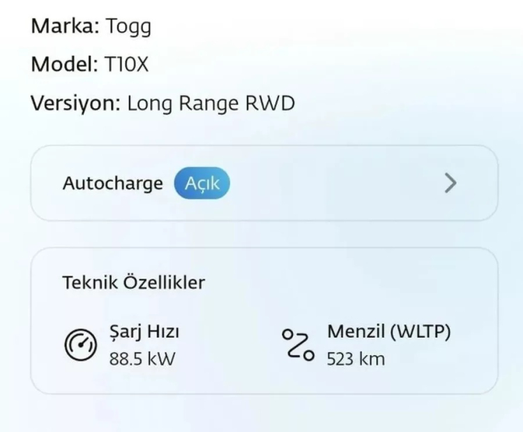Özellikten faydalanabilecek araçların gereksinimleri de netleşti. Paylaşılan detaylara göre, 1.7.2 yazılım sürümüne sahip TOGG T10X ile 2.0 yazılımını barındıran TOGG T10F modelleri Autocharge özelliğini sorunsuz biçimde kullanabilecek.