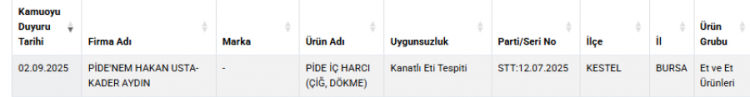 Tarım ve Orman Bakanlığı, 'Taklit veya Tağşiş Yapılan Gıdalar' listesini güncellemeye devam ediyor. Çeşitli ürünlerin eklendiği listeye bu sefer Bursa'dan ünlü bir pide firması girdi. Yapılan incelemelerde pide iç harcının içerisinde kanatlı eti tespit edildiği belirtildi.