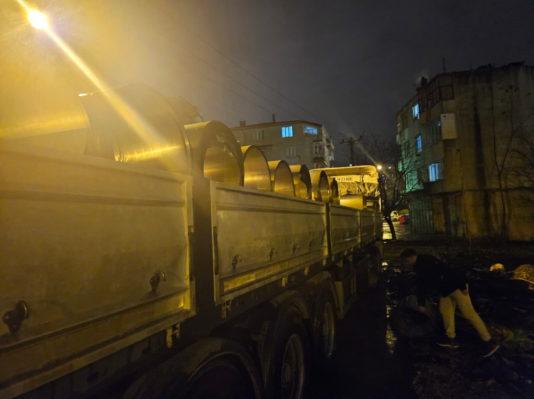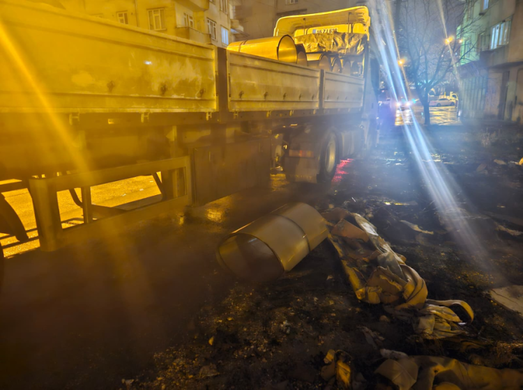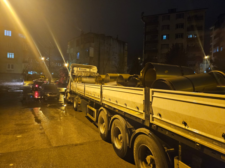 TIR'ın üzerindeki rulo saçlardan birini aşağı atan şahıs, daha sonra kendisi de aşağı inerek yanındaki çocuklarla birlikte ağır malzemeyi sürükleyip götürmeye çalıştı.