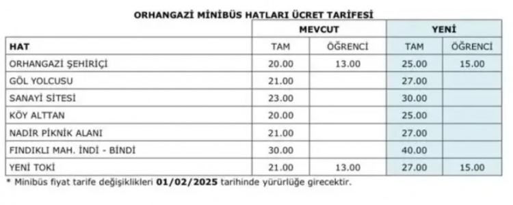 Bursa'nın Orhangazi ilçesinde şehir içi yolcu taşıma ücretlerine zam geldi. Alınan zam kararı ile 20 TL olan taşıma ücreti 25 TL'ye, 13 TL olan öğrenci ise 15 TL'ye yükseltildi. Orhangazi'de zamlı taşıma fiyatları yarın ( Cumartesi ) itibarıyla geçerli olacak.