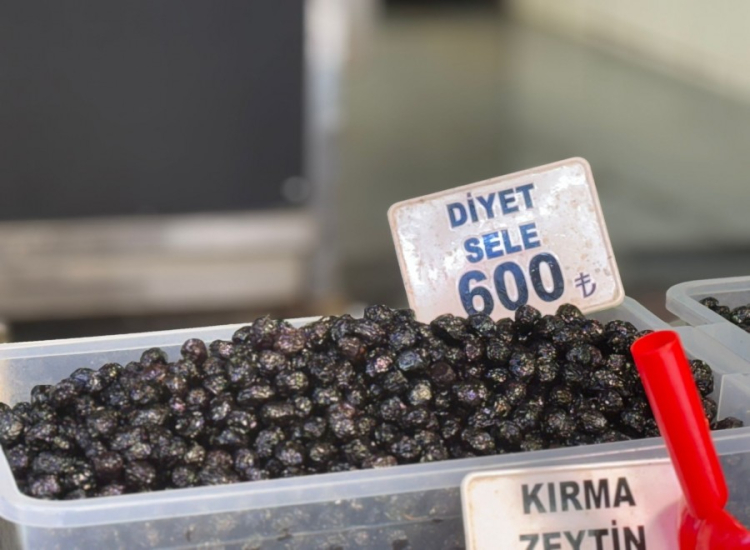 Pazarlarda en çok rağbet gören tezgahlardan biri de zeytin tezgahları. Zeytinlerde ise az tuzluluk oranıyla bilinen diyet sele zeytin, kilosu 600 TL'ye satışa sunuluyor.
