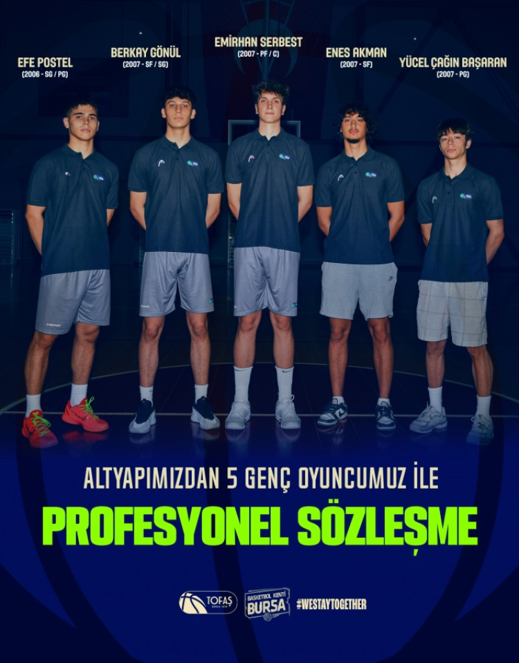 Bursa temsilcisi TOFAŞ, 5 yeni oyuncu ile sözleşme imzalandığını açıkladı. Efe Postel, Emirhan Serbest,Berkay Gönül, Yücel Çağın Başaran ve Enes Akman profesyonel sözleşmeye imza attı.
