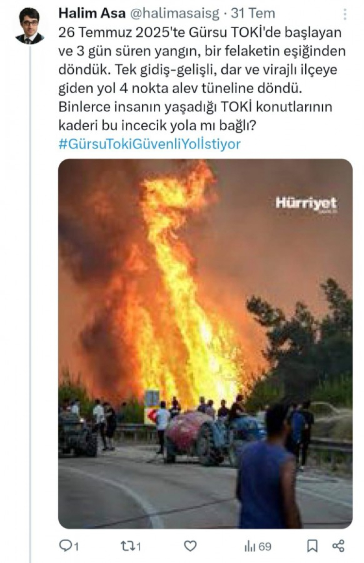 İş sağlığı ve güvenliği danışmanı Halim Asa, 26 Temmuz 2025'te Gürsu TOKİ'de başlayan ve üç gün süren yangına dikkat çekerek, bölgedeki yol yetersizliğinin büyük bir felakete yol açabileceğini ve verilen yeni yol sözüyle ilgili de herhangi bir çalışmanın başlamadığını söyledi.